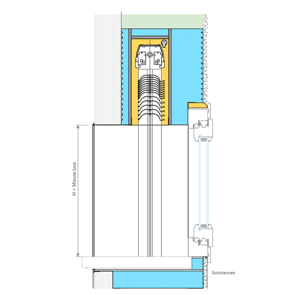 Stessa conformazione di spalla ma cassonetto completamente diverso per l’alloggiamento delle Frangi-sole, anche in questa versione è possibile adattare il monoblocco alle specifiche richieste del committente con posizionamento del serramento a filo muro e/o all’interno della mazzetta. Anche in questa conformazione è possibile dotare il monoblocco del quanto lato “sottobancale”. Esempio di cappotto esterno e serramento filo muro interno.